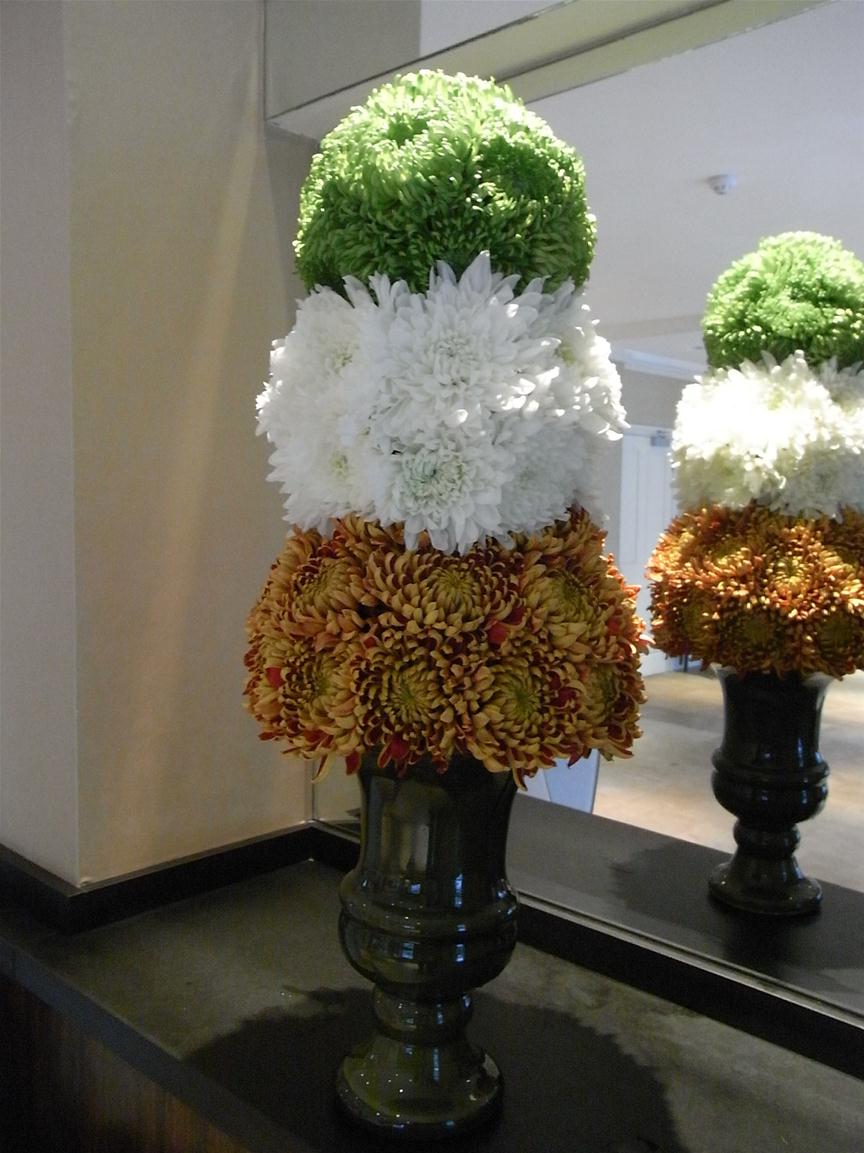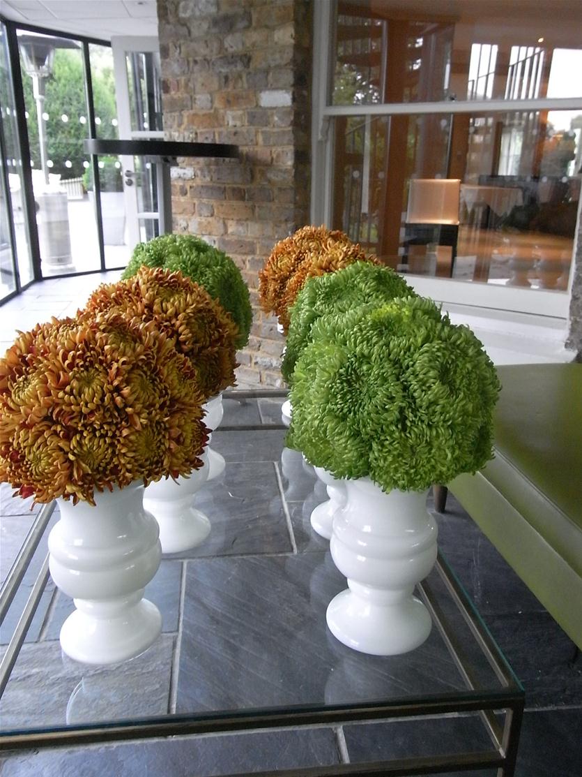 For this civil partnership at the Bingham Hotel in Richmond we created stacks of Chrysanthemum Blooms in coloured glass ‘Urn’ shaped vases. Our brief came from Mike who wanted Chrysanthemum Blooms used as his Grandfather grew them when he was a child. Taking this on board the design uses a traditional flower to create a modern and chic piece that had impact.
