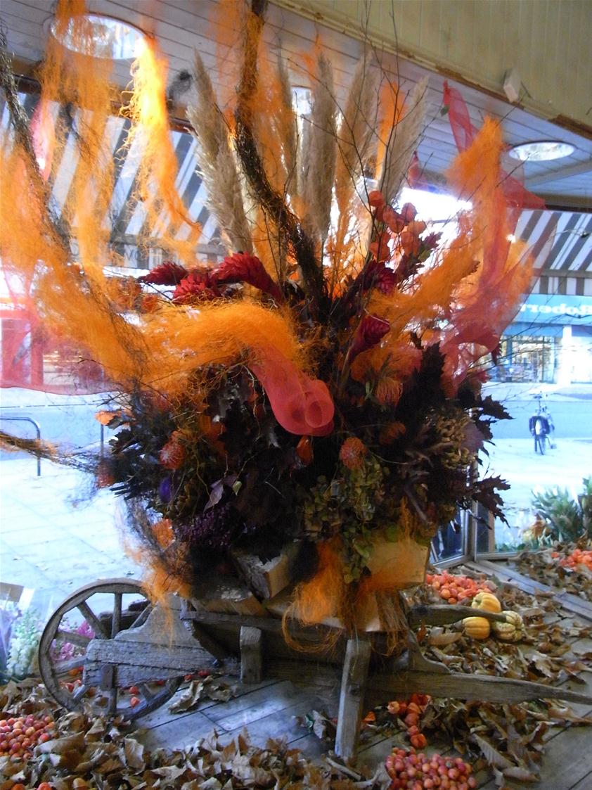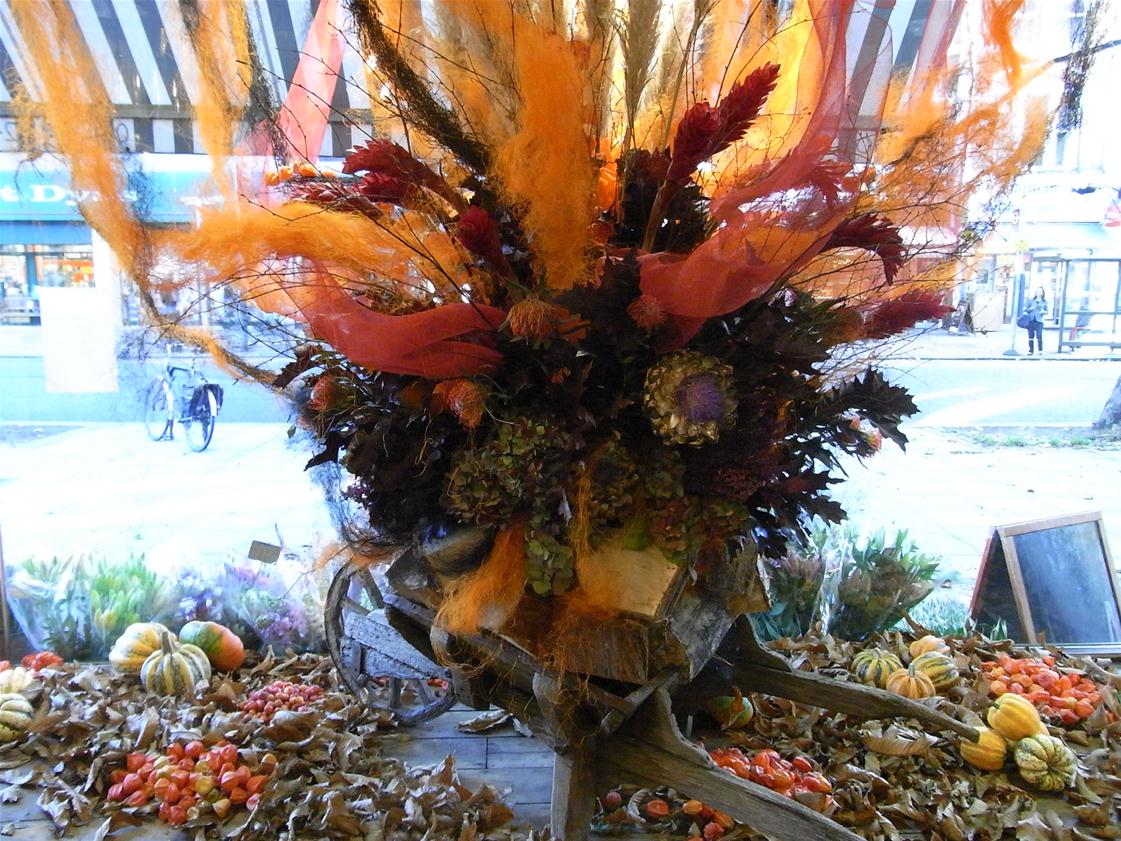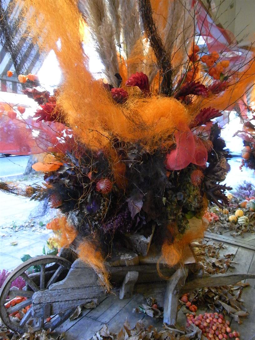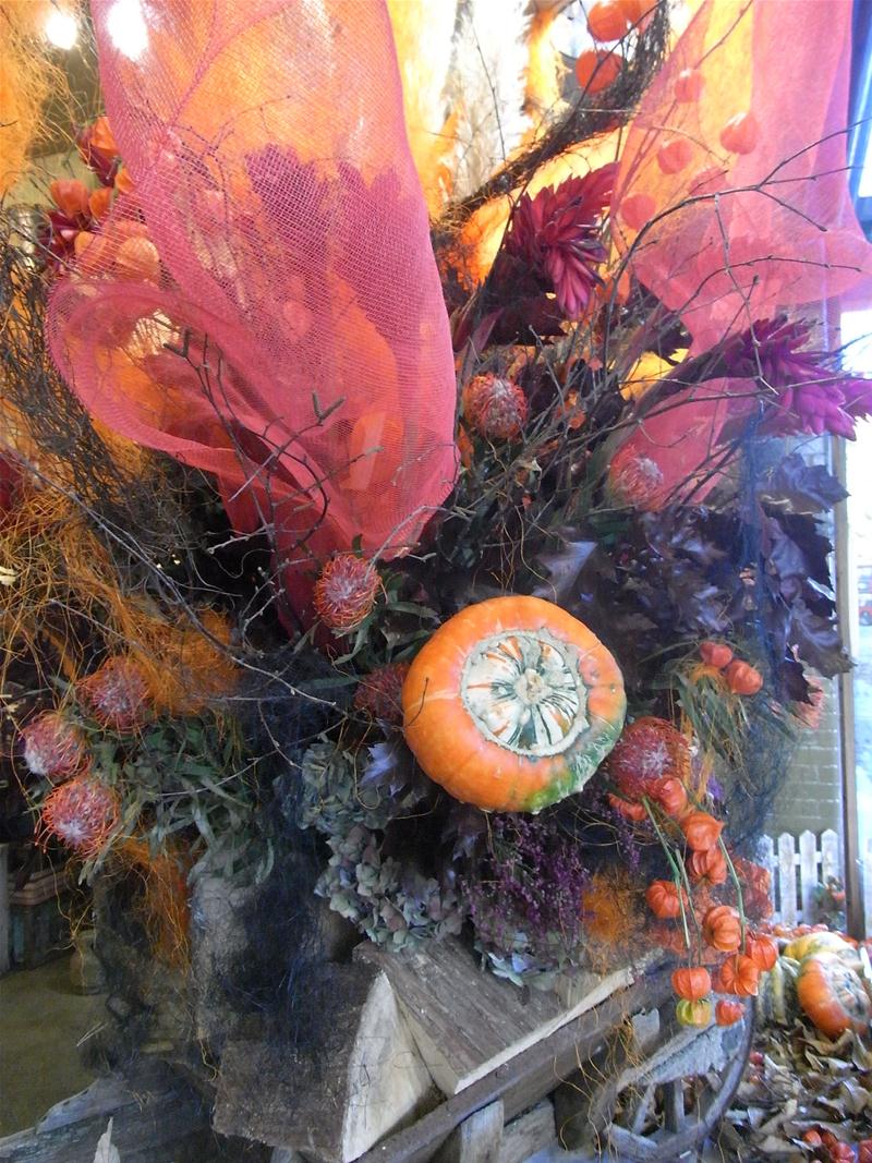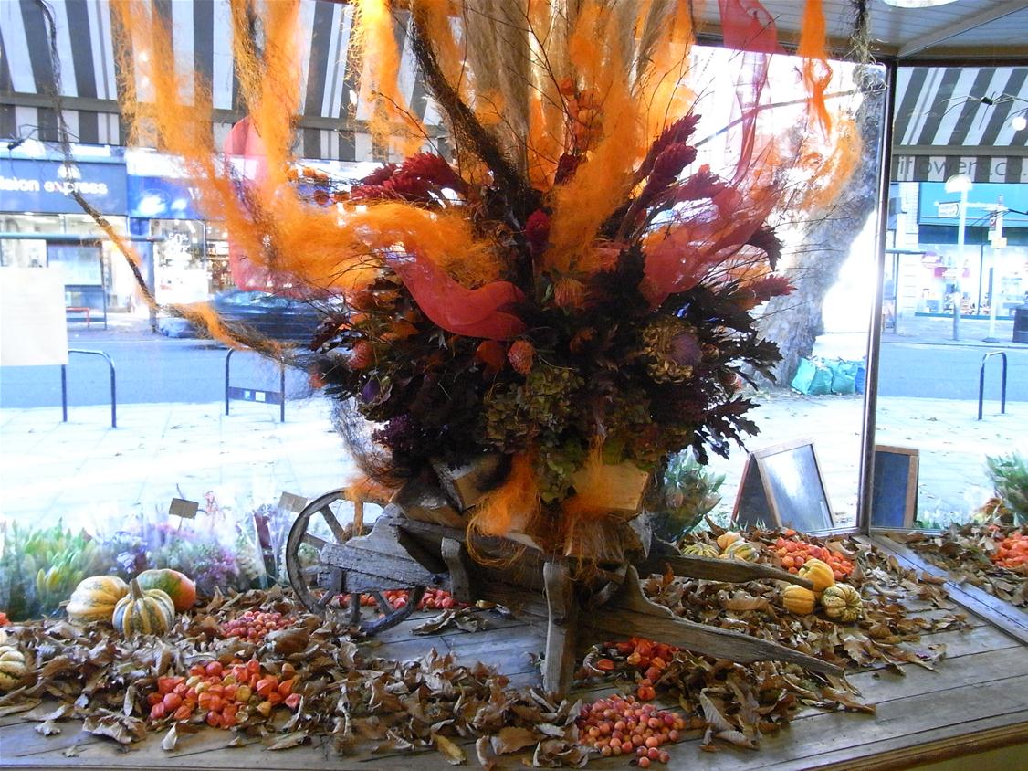Come and warm your hands on our latest window installation, the Pot Pourri seasonal bonfire. Plooms of smokey Pampus Grass, flames of orange Sisal & red Netting, and Physallis embers will blow you away. Our fantastic selection of autumn foliages and flora varieties will add rich colour and interest to the scariest of Halloween parties