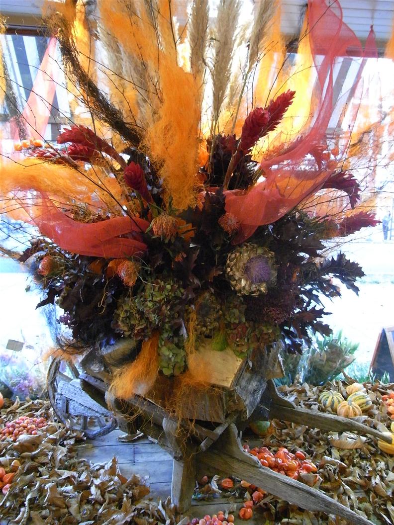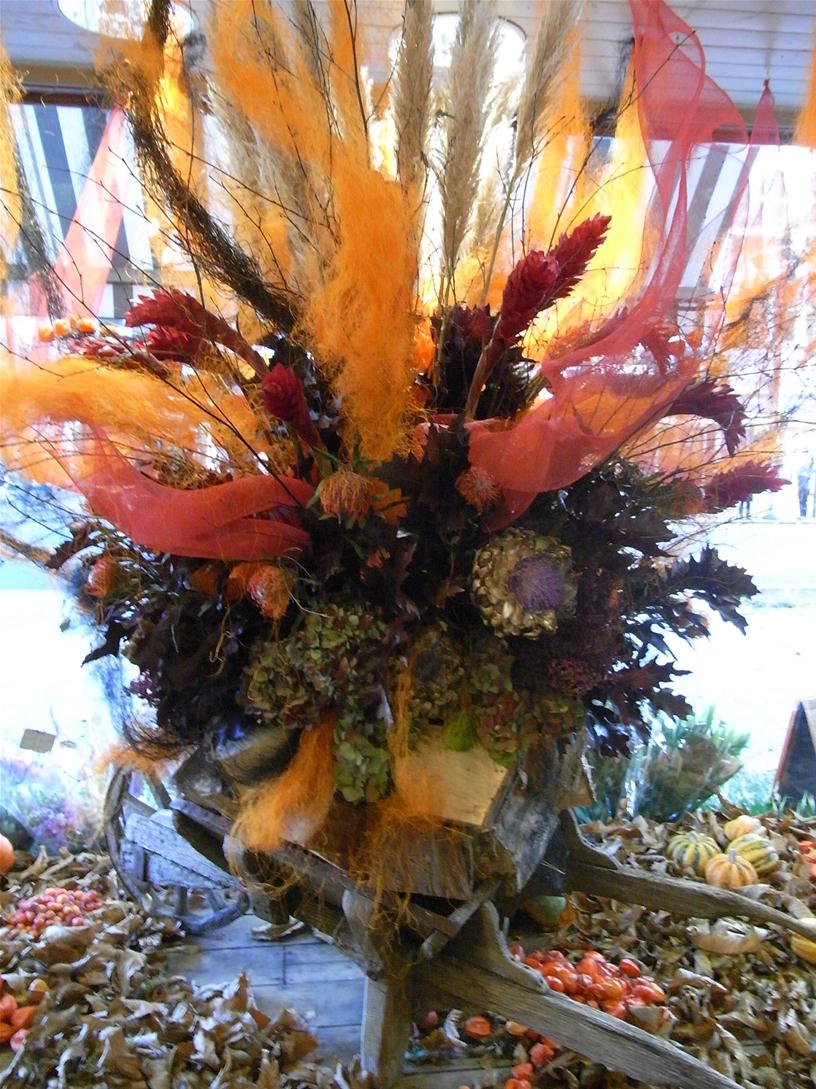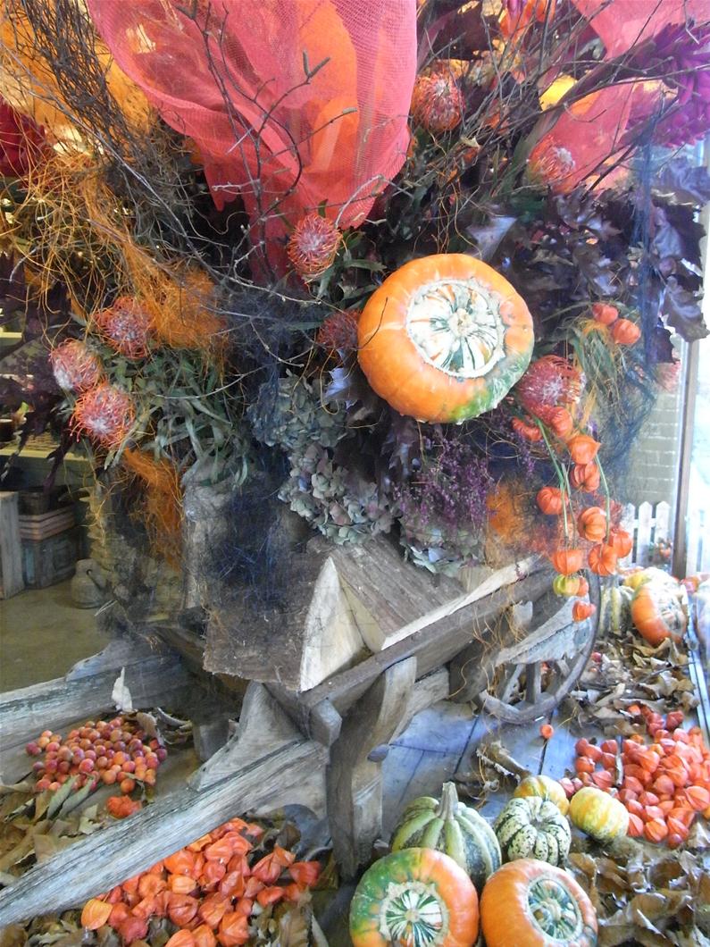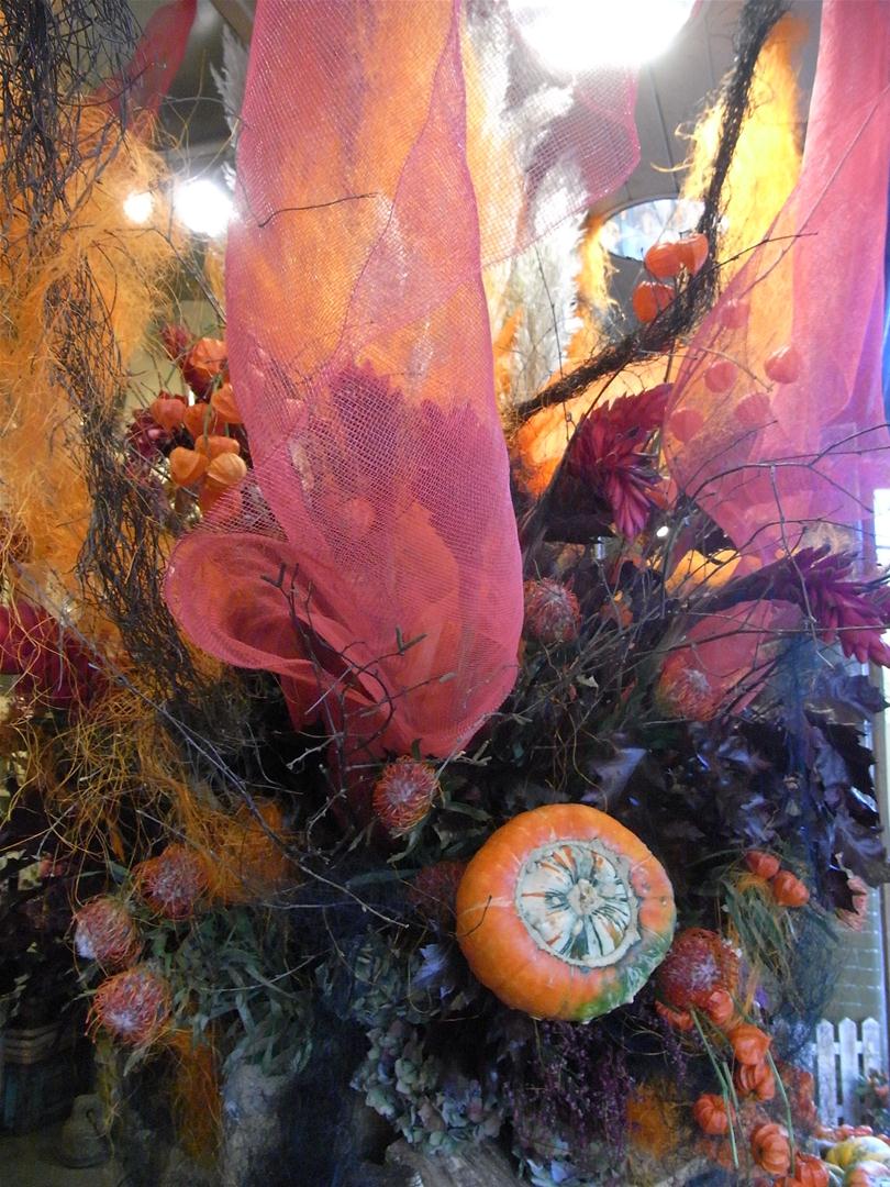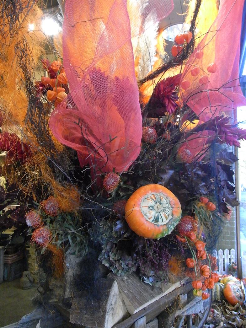 Come and warm your hands on our latest window installation, the Pot Pourri seasonal bonfire. Plooms of smokey Pampus Grass, flames of orange Sisal & red Netting, and Physallis embers will blow you away. Our fantastic selection of autumn foliages and flora varieties will add rich colour and interest to the scariest of Halloween parties