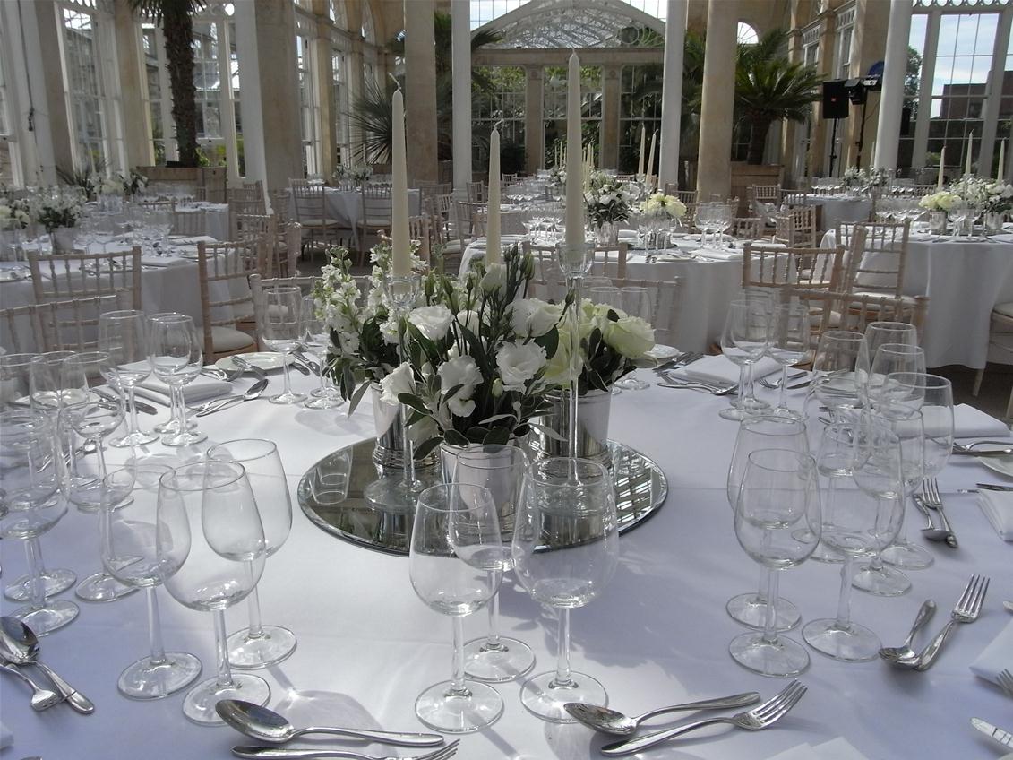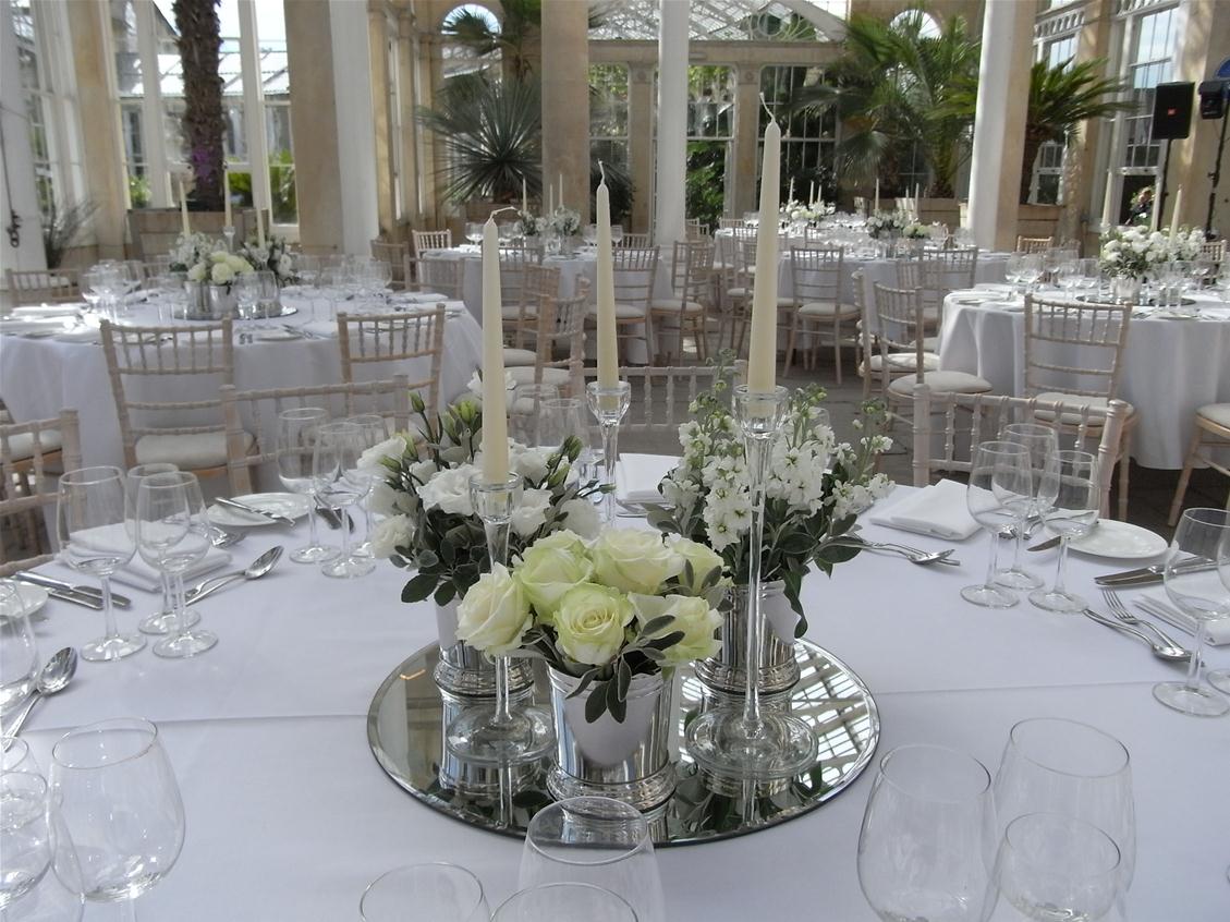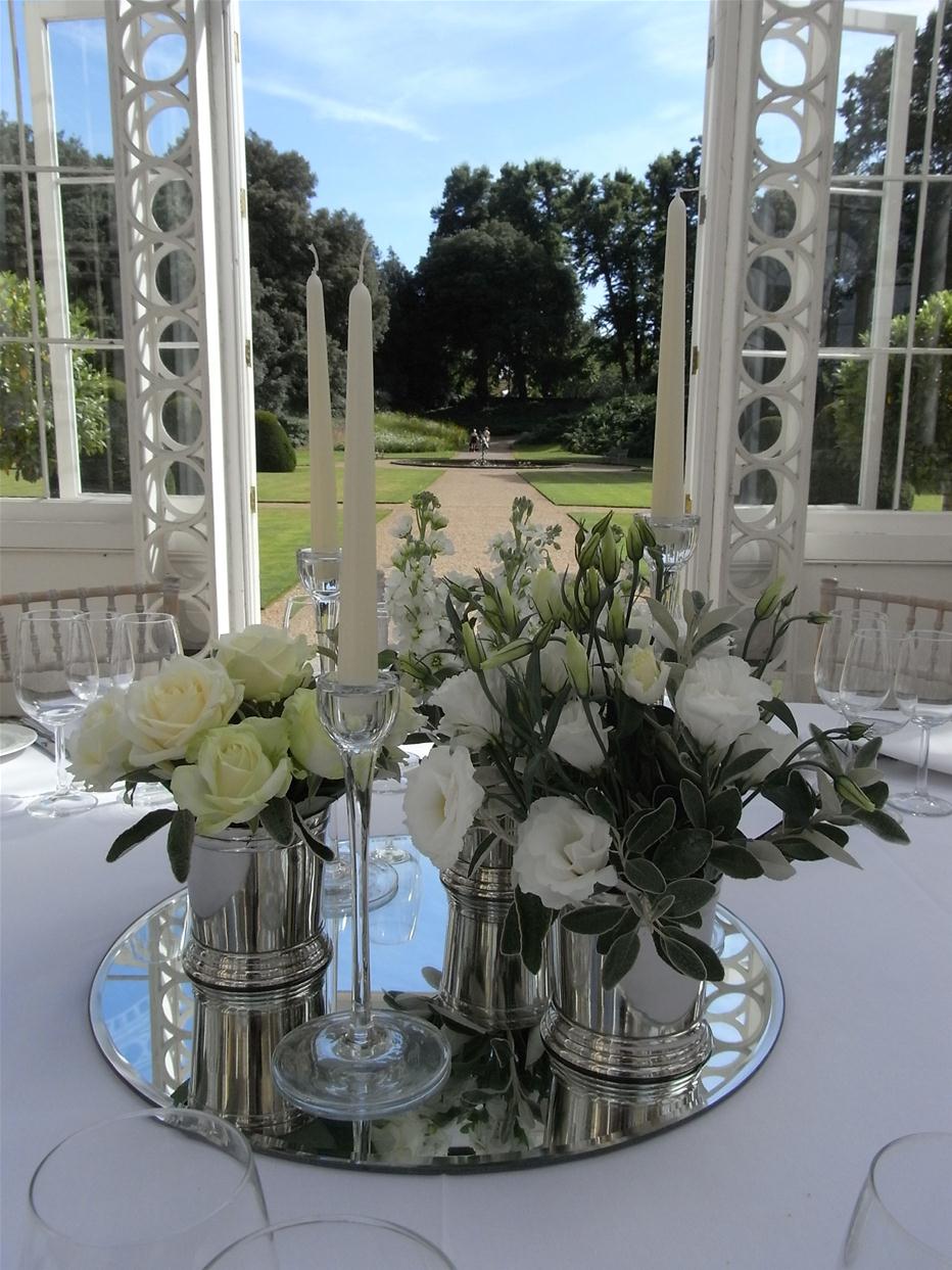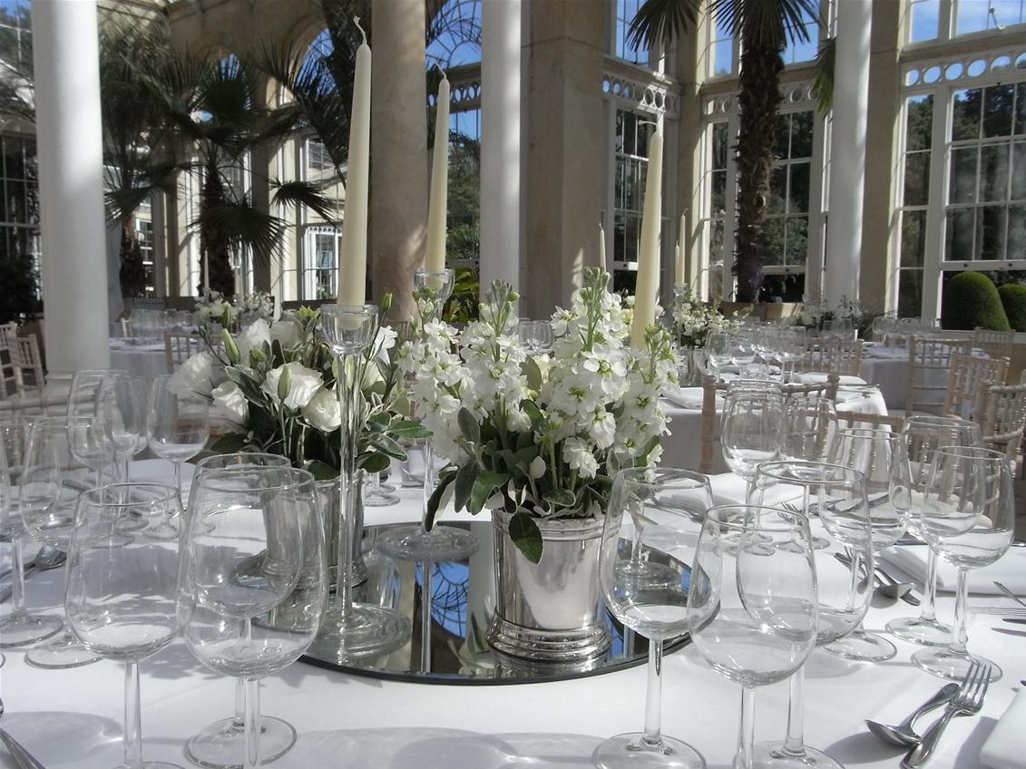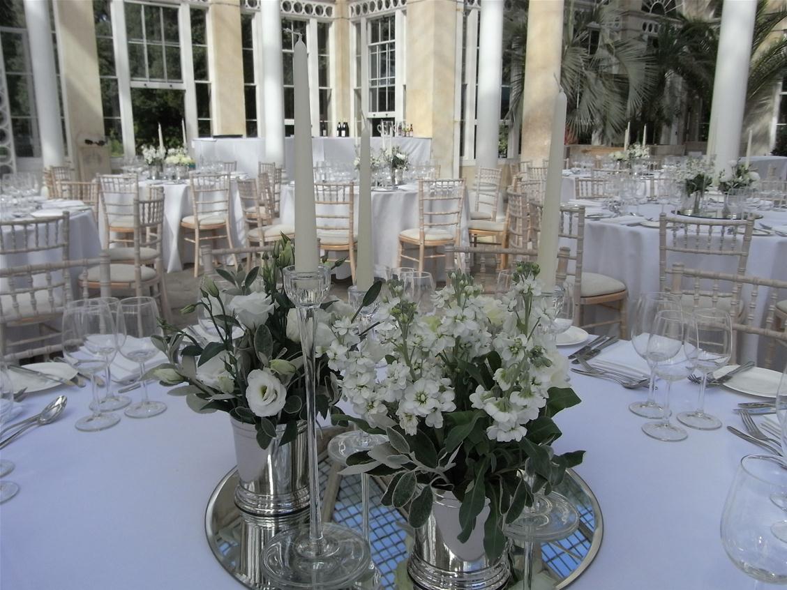 This pure and simple floral design works beautifully at Syon House. As the sun catches the conservatory the reflective aluminium beakers and mirrors throw out the glistening rays across the room. One of my favourite designs, chic whites arranged individually for impact and to modernise the look, bursting with elegance and brightness.