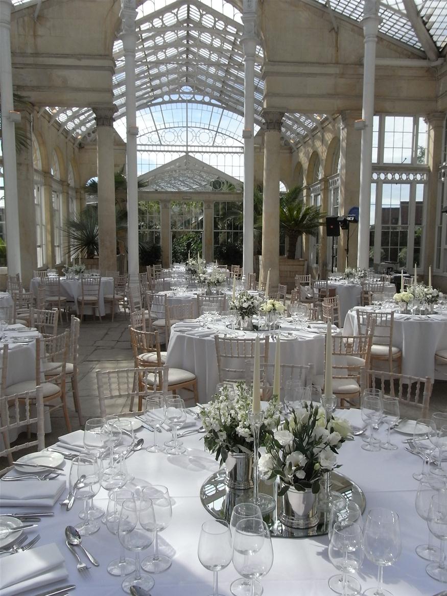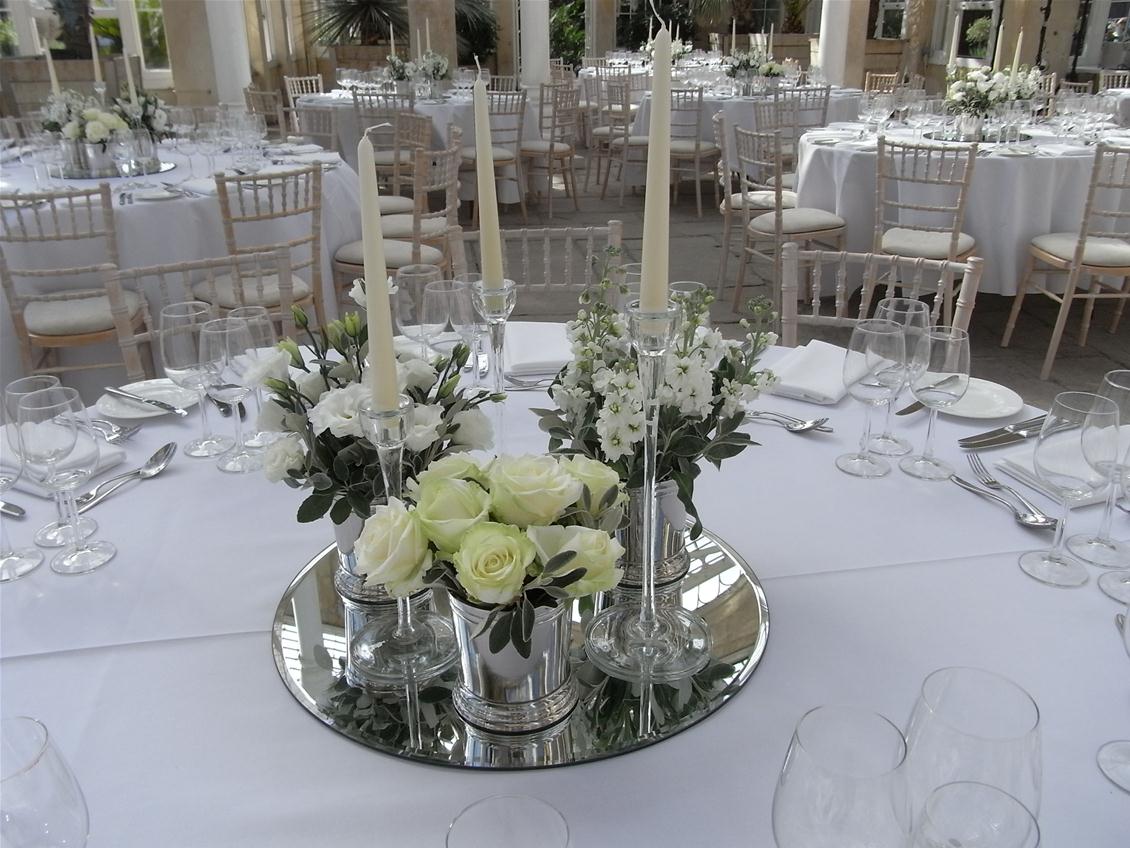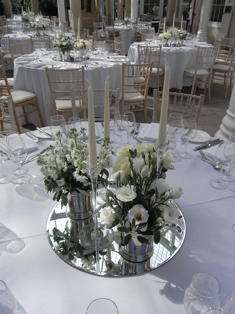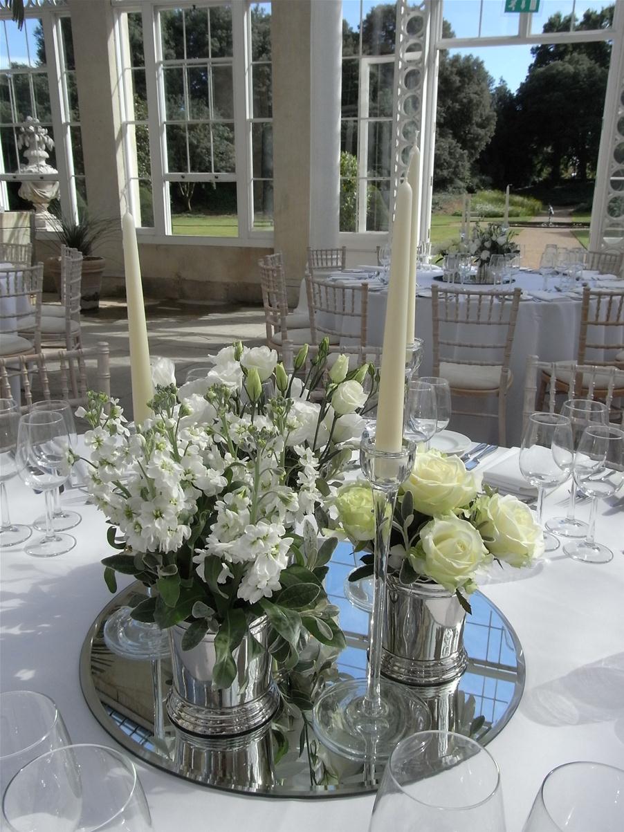 This pure and simple floral design works beautifully at Syon House. As the sun catches the conservatory the reflective aluminium beakers and mirrors throw out the glistening rays across the room. One of my favourite designs, chic whites arranged individually for impact and to modernise the look, bursting with elegance and brightness.