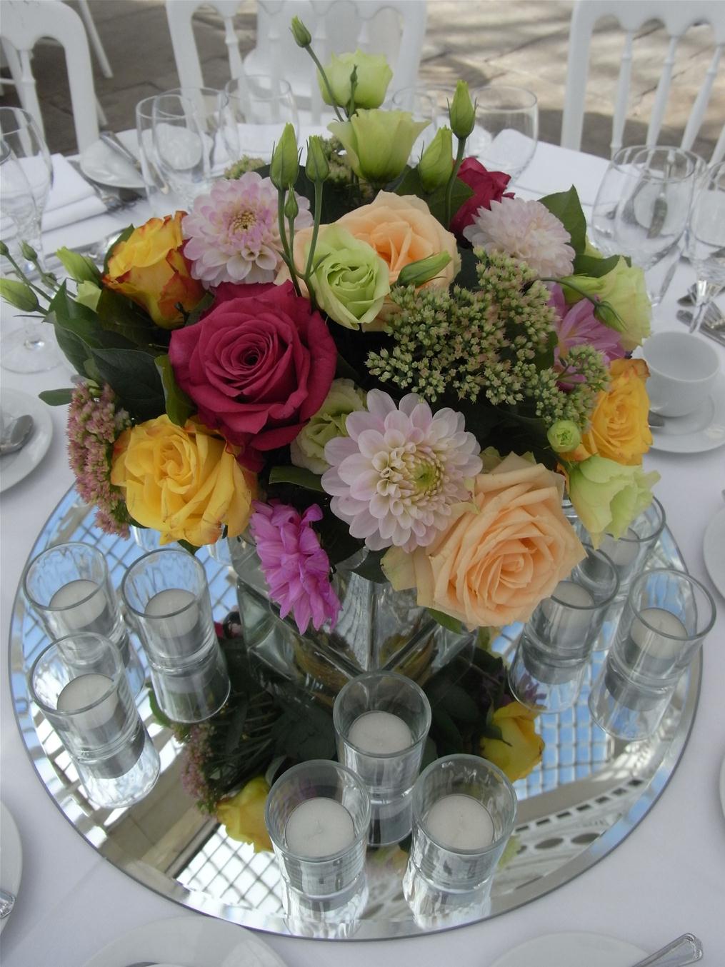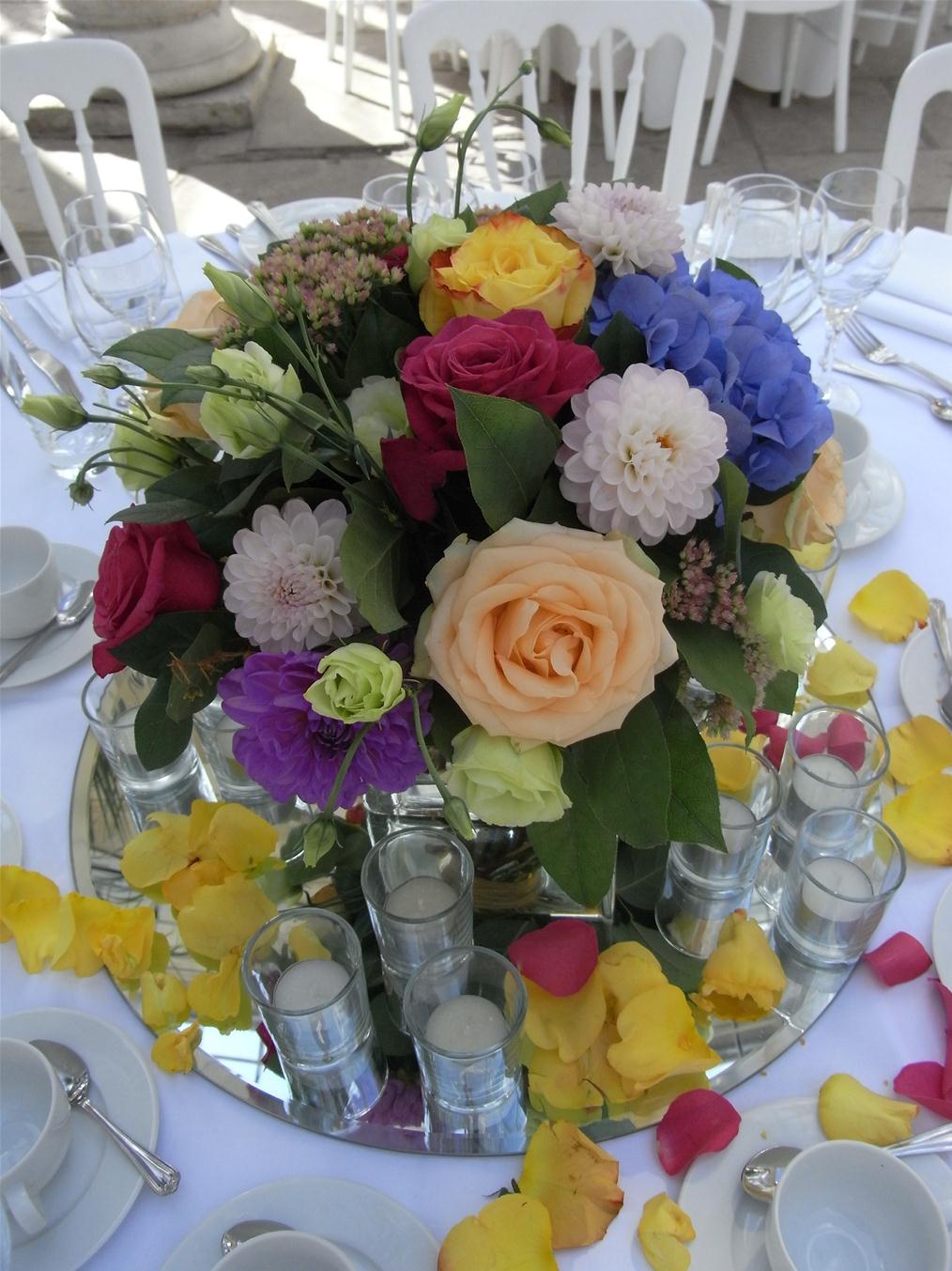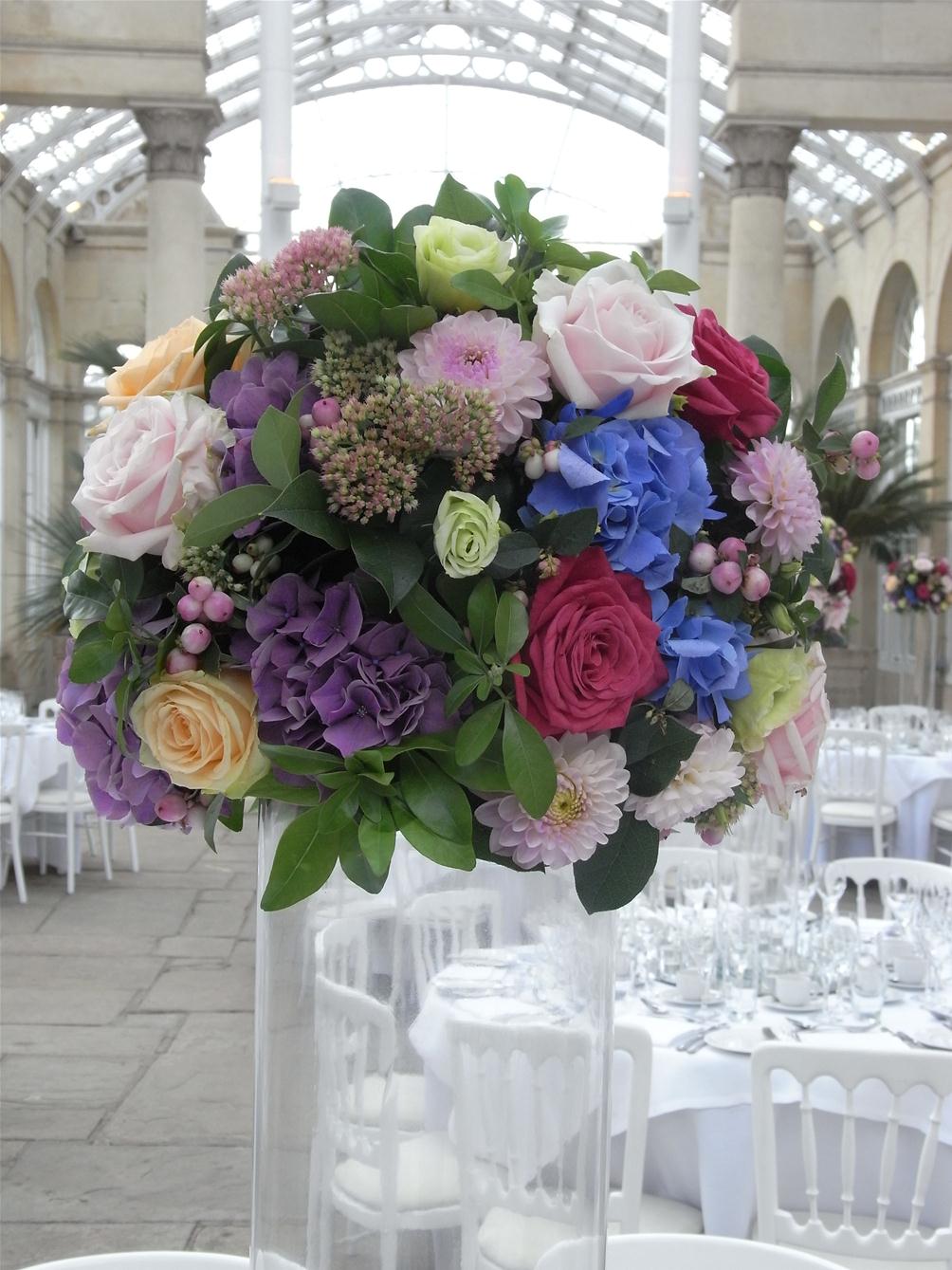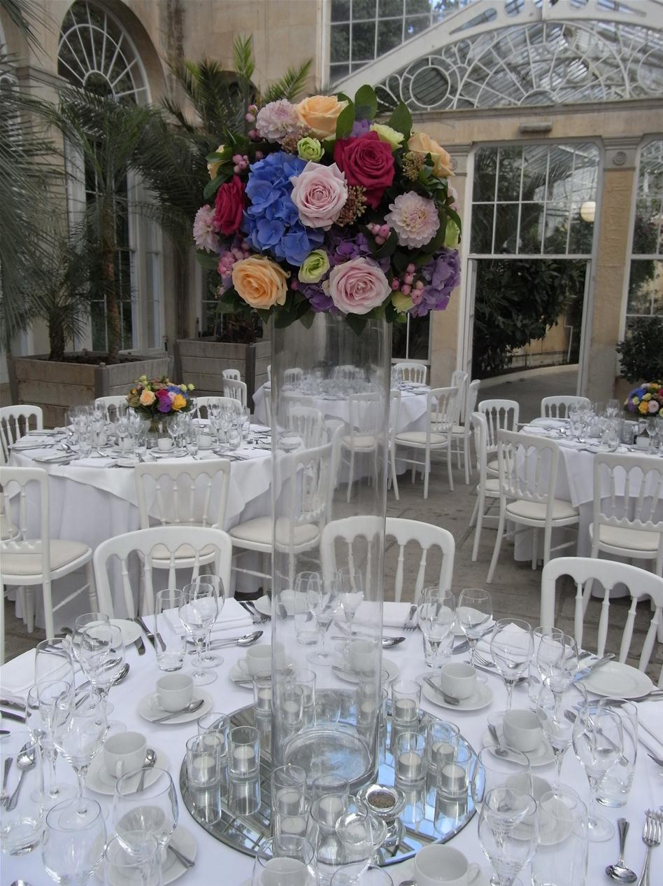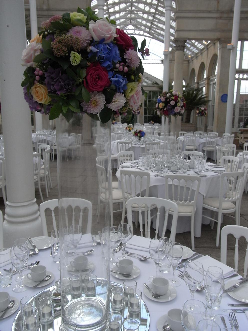 Colourful floral varieties were arranged in a contemporary style on top of clear glass cylinder vases. Floating perfectly above tables with lower sphere shaped pieces to compliment, they lifted the conservatory at Syon House.